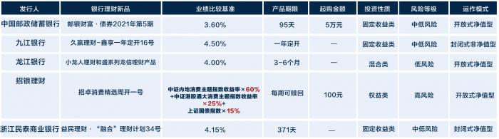 从权益类产品来看,招银理财“招卓消费精选周开一号权益类理财计划”业绩比较基准为中证内地消费主题指数收益率×60%+中证港股通大消费主题指数收益率×25%+上证国债指数×15%,风险评级为高风险。