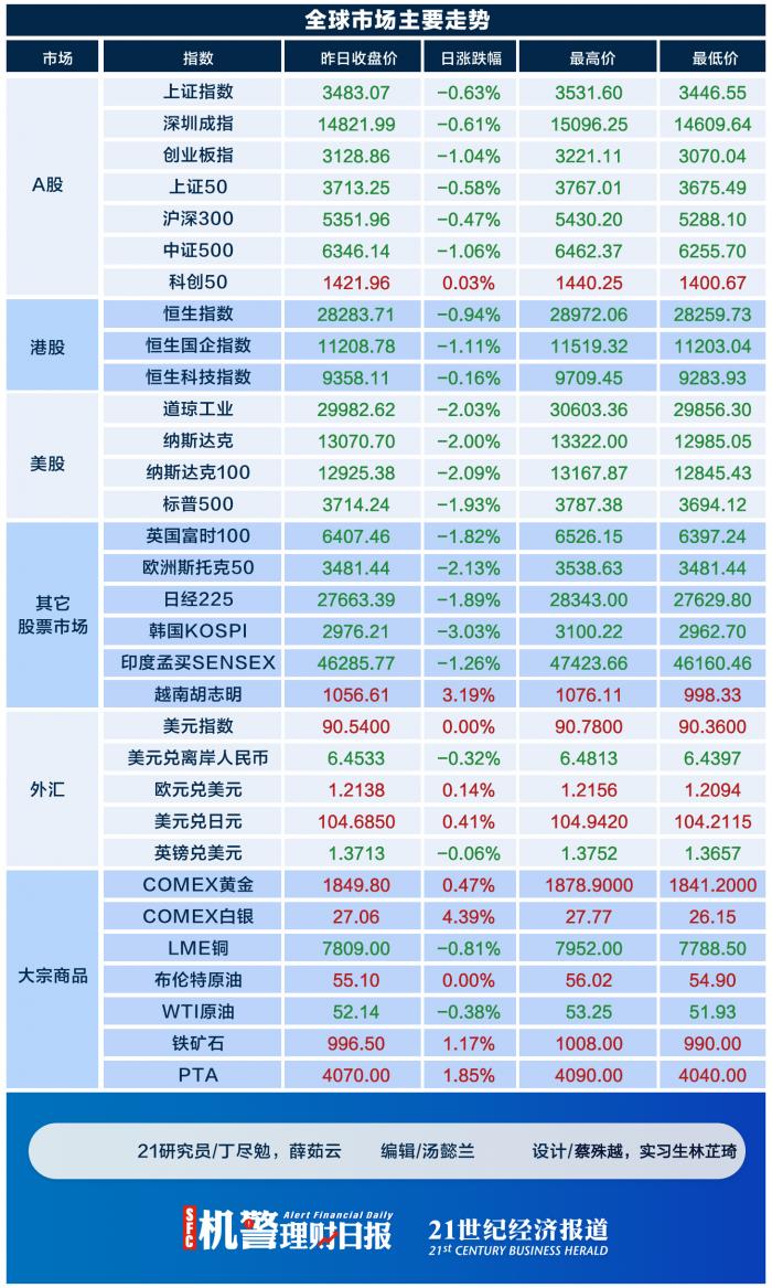 上周五,A股震荡下跌,上证指数报收3483.07,下跌0.63%;深证成指报收14821.99,下跌0.61%;创业板指数报收3128.86,下跌1.04%。两市成交量为0.95万亿,较前日缩量。