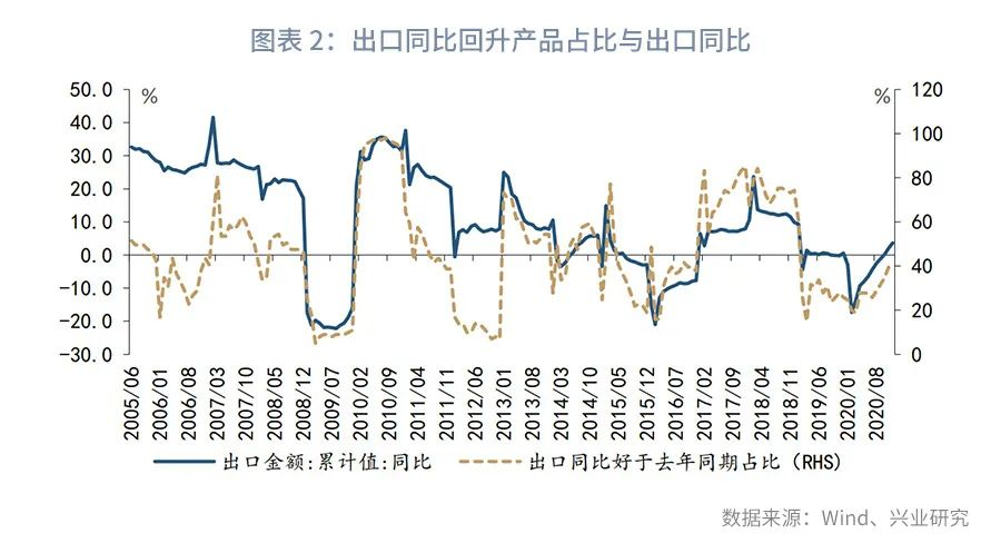 从需求端看,2020年出口超预期增长成为拉动我国经济增长的主要来源,然而新出口订单指数并未预见本轮出口的复苏:2020年3月至8月新出口订单始终位处50%荣枯线下,而2020年6月以来我国出口便恢复正增长且随后迅速飙升。二者的背离主要是由于出口呈结构性增长,即少数产品贡献了多数增长。以HS2分位产品为例,截至2020年12月,出口同比读数好于去年同期仅占全部产品的37.6%,而同期出口同比读数回升了3.1个百分点,参见图表2。