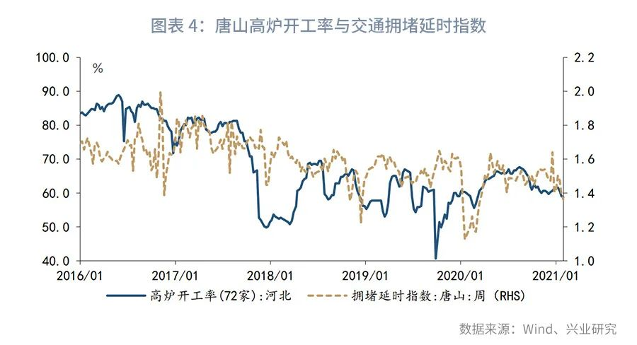 从供给端看,12月以来疫情在河北、北京、吉林、黑龙江等地散点式爆发,各地纷纷收紧疫情防控措施,生产活动放缓。以河北唐山为例,截至1月29日唐山市高炉开工率降至2020年2月28日以来的最低值,同期唐山市交通拥堵指数也降至2020年3月13日以来的最低值,参见图表4。