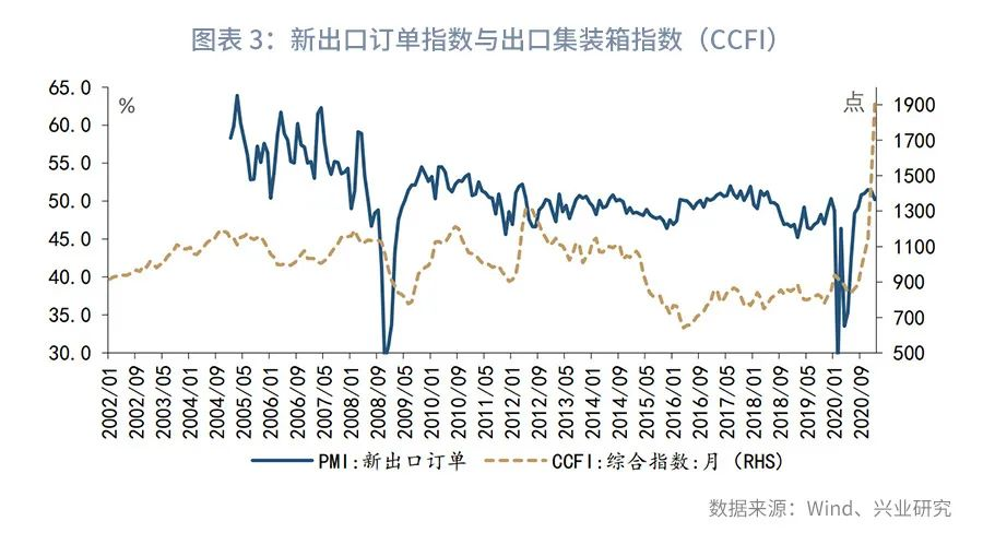 表现在宏微观数据上,新出口订单下滑而出口集装箱指数连创新高。1月新出口订单较前月下滑1.1个百分点至50.2%,为2002年8月以来的最低值;然而,截至1月19日,出口集装箱指数(CCFI)升至2040.2,为有数据记录以来的最高值,参见图表3。