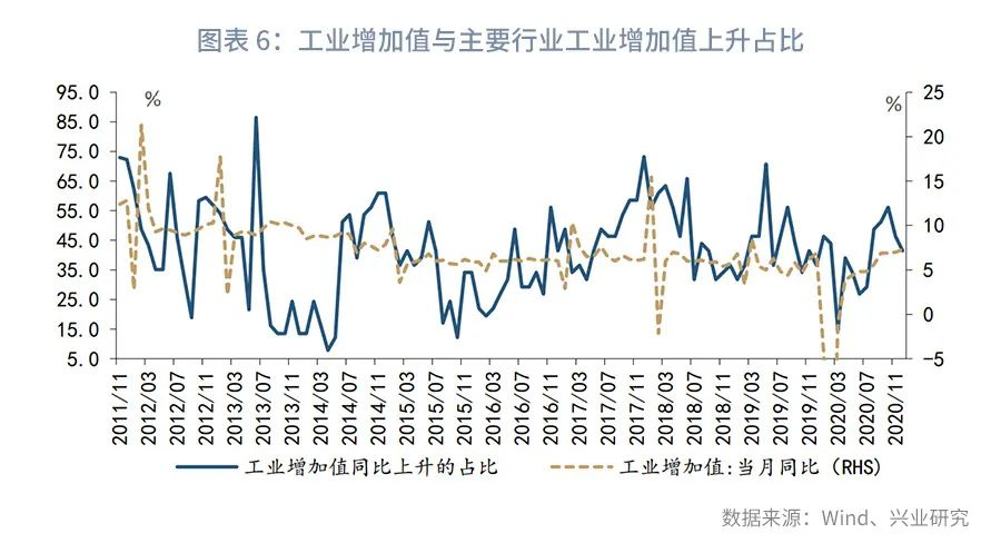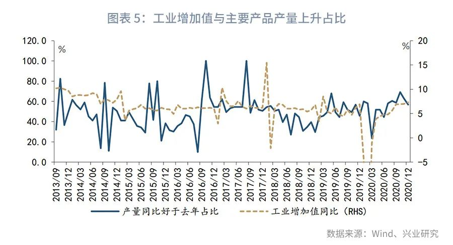 需要指出的是,在不均衡需求增长的带动下,不同产品与行业生产恢复进度也出现了分化。以统计局披露的主要工业产品产量数据为样本,本文统计其同比读数好于去年同期的占比发现,截至2020年12月,仅有57%的主要工业产品产量同比恢复至去年同期水平以上,而12月工业增加值为7.3%,高于去年同期0.4个百分点,参见图表4。分行业观察,在统计局公布的41个工业行业中,同比较去年上升的行业占比仅为41%,半数以上的行业生产活动尚未恢复至去年同期水平。