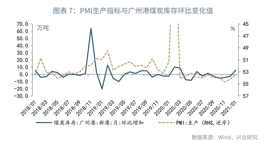 其次,从微观指标观察,发电量、出口集装箱指数为我们跟踪生产与外需的关键指标。发电日均耗煤量较好的追踪了生产全貌,但自2020年7月以来六大发电集团日均耗煤量数据停更,同浙电日均耗煤量尚未更新1月的数据。为此,本文用港口煤炭库存量作为代理指标,数据显示,1月广州港煤炭库存去化进程放缓,与1月生产指数放缓互相印证,参见图表6。