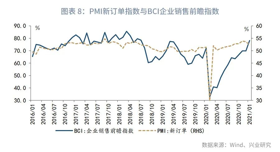从需求指标看,如前文所示,新出口订单连续两个月下滑,但出口集装箱指数却连创新高,二者显著背离。考虑到企业接单和出口之间存在时滞,出口集装箱指数或为新出口订单的后验。进一步,本文比较BCI企业销售前瞻指数与PMI新订单指数发现,二者在1月份出现了显著背离,即BCI企业销售前瞻指数大幅上升至2018年7月以来的最高值,而PMI新订单却回落至2020年8月以来的最低值,参见图表7。相对而言,BCI样本中对中小企业更具代表性,或对出口的描述更为准确。