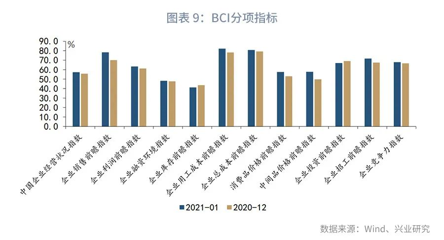 最后,从其他景气指标看,BCI(长江商学院中国企业经营状况指数)指数显示,1月各项指均延续改善局面,与PMI分项指标全面走弱相互背离,参见图表8。这或与疫情散点爆发的区域差异有关,即本轮疫情爆发集中分布在淮河以北区域,而BCI以中小企业为样本,主要分布在长三角和珠三角地区。某种程度上,珠三角及长三角作为外来务工人员主要输入地,受益于就地过年政策,其生产和需求指标或较少受到春节节假日扰动。