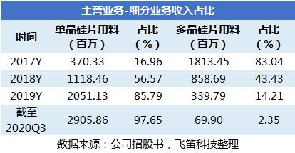 细分业务看,多晶硅业务可分为单晶硅片用料和多晶硅片用料。由上面的表格可以看到,报告期内,公司的单晶硅片用料收入占多晶硅整体收入的比重急剧上升,截至2020年三季度占比达到98%,而多晶硅片用料的占比则相反,截至2020年三季度下滑至2%。