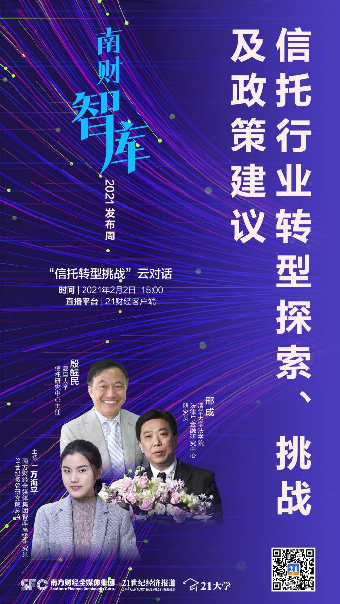 2月2日,南财集团智库发布周之《信托行业转型探索、挑战及政策建议》报告正式发布。与此同时,“信托转型挑战”云对话在线上召开,清华大学法学院法律与金融研究中心研究员邢成、复旦大学信托研究中心主任殷醒民两位信托行业专家参与了此次线上对话,针对信托行业转型必要性、挑战和方向、对监管政策的建议、对行业未来定位和格局几大问题发表了各自的观点。