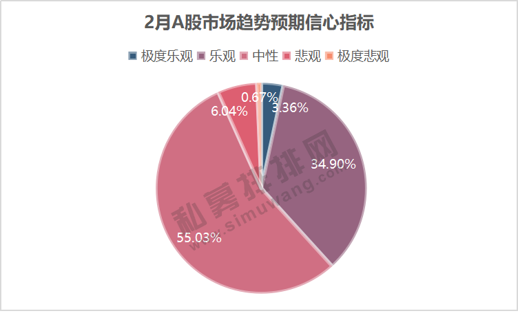 具体来看,38.26%的私募乐观看待2月行情,6.71%的私募对2月行情持悲观态度,相较于上月提高6个百分点,另有超过一半的私募持中立态度。