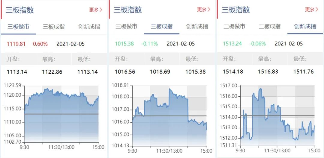 截至2月5日收盘,三板做市报1119.81点,上涨0.60%;三板成指报1015.38点,下跌0.11%;三板创新成指报1513.24点,下跌0.06%。