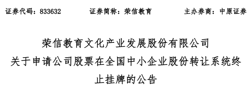2月5日消息,荣信教育(833632 )发布公告称,公司申请首次公开发行股票并在创业板指上市的申请于1月20日获得通过,公司拟向申请股票在新三板终止挂牌。