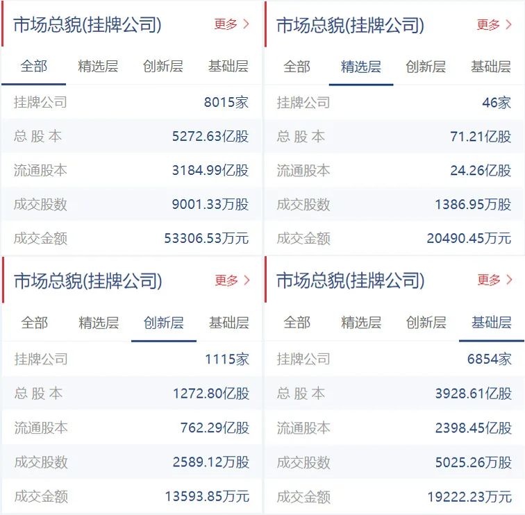新三板挂牌公司总计8015家(精选层46家,创新层1115家,基础层6854家),总股本5272.63亿股,流通股本3184.99亿股。