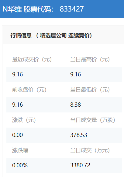 华维设计的保荐机构为东北证券,公司精选层的发行价为9.16元/股。