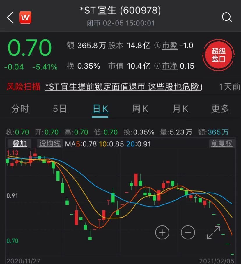 截至2月5日收盘,*ST宜生报0.70元每股,已经连续14个交易日(1月19日-2月5日)收盘价格均低于1元。