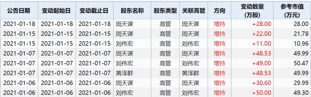 Wind数据显示,截至1月18日,刘伟宏、周天谋分别累计增持110万股、129.13万股,另一位高管黄泽群累计增持48.53万股。期间3人累计共增持287.66万股。