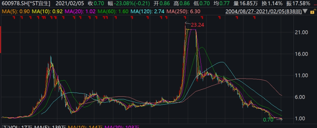回想当初,*ST宜生(原名:宜华生活)也曾是一只大牛股,成立于2001年,从事软体家具、一体化橱柜衣柜、智能家具及家具用品的研发和经营等。于2004年8月在上交所主板上市,发行价格6.68元每股。上市后最高点为2015年6月的每股124.35元(后复权)。5年多的时间,公司市值已蒸发近340亿元,股价累计下跌幅度高达98%。