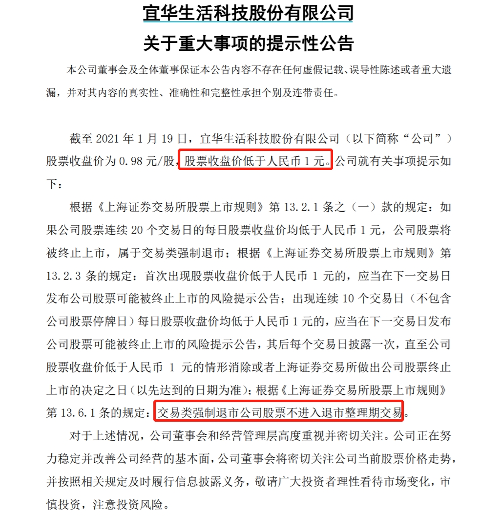 关于退市风险,*ST宜生自1月19日第一次股价低于1元时,便已发布重大事项提示公告,称交易类强制退市公司股票不进入退市整理期交易。随后,公司多次公告,公司股票可能被终止上市,并屡次提示交易类强制退市公司股票不进入退市整理期交易。