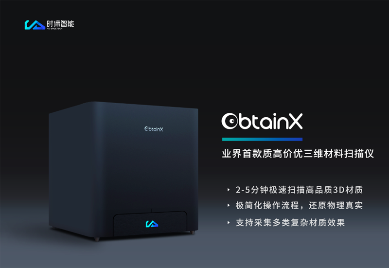 时谛自主研发的ObtainX材料扫描仪,是建设材料库必不可少的一款配套工具。该产品能够2-5分钟极速扫描、简化操作流程、还原材质物理真实、呈现多类复杂材质效果,为时尚企业提供一套完备的解决方案。