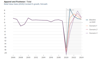 以纺织服装及零售企业为例,海外集团裁员、大范围关闭门店、申请破产保护甚至破产清算的消息不断。鞋服行业作为高度国际分工的行业,终端销售下滑引发了整个产业链风险的上升。根据Euromonitor International的预测,2020年全球服装和鞋类销售额将下降17%,成为受疫情影响最严重的行业之一。