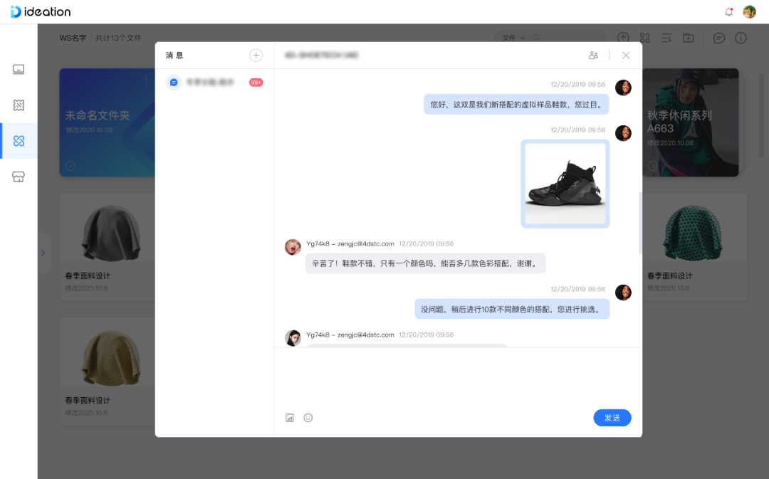 在ideation平台,鞋箱包产业链上各节点人员可以在线批注、留言、修改、讨论等。通过添加成员,他们还可以在线讨论产品款式设计,在3D模型上进行标注,并留下修改意见。