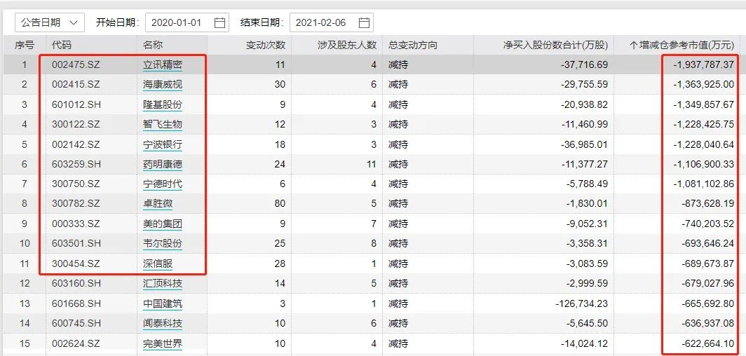 先来看看总的情况,最近一年多来(2020年以来),已有立讯精密、海康威视、隆基股份、智飞生物、宁波银行、药明康德、宁德时代被重要股东减持超100亿元,这些个股票都是这两年的大牛股,市值达几千亿乃至逼近万亿;其中立讯精密被重要股东减持高达194亿元。