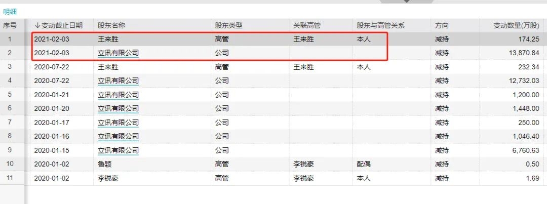 2月4日,立讯精密公告,控股股东立讯有限及其一致行动人、立讯精密实际控制人之一、副董事长王来胜于2021年2月3日通过大宗交易系统减持公司股份共计1.4亿股,占公司总股本2%。公告表示,减持资金将主要用于其他产业投资及部分偿还立讯有限银行借款的资金需求。