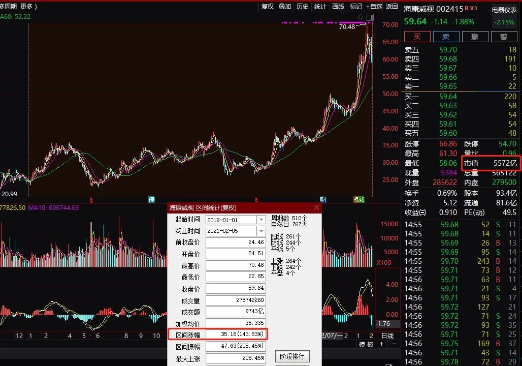 2019年以来,海康威视的股价涨幅高达144%,最新收报59.64元,市值为5572亿元。