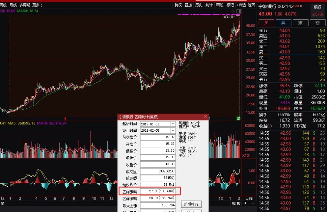 2019年以来,股价最强的银行股,宁波银行股价暴涨181%。今年2月5日股价大涨4.07%,再创历史新高,市值达到2583亿元。