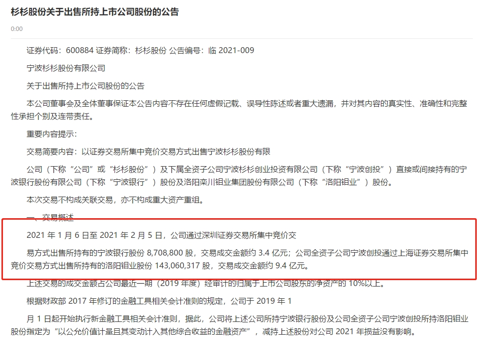 2月5日晚间,杉杉股份公告称,1月6日至今,公司通过深交所集中竞价交易方式出售了所持有的宁波银行870.88万股,成交金额约3.4亿元。本次出售后,杉杉股份不再持有宁波银行股份。