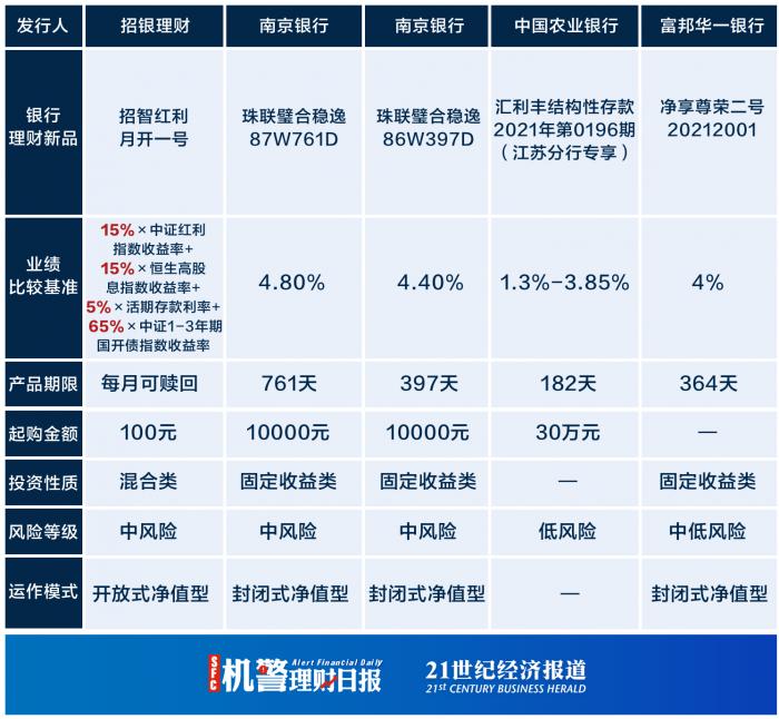 (1)招银理财,招睿颐养丰润三年定开2号增强型固收类理财计划,业绩比较基准为5.3%;