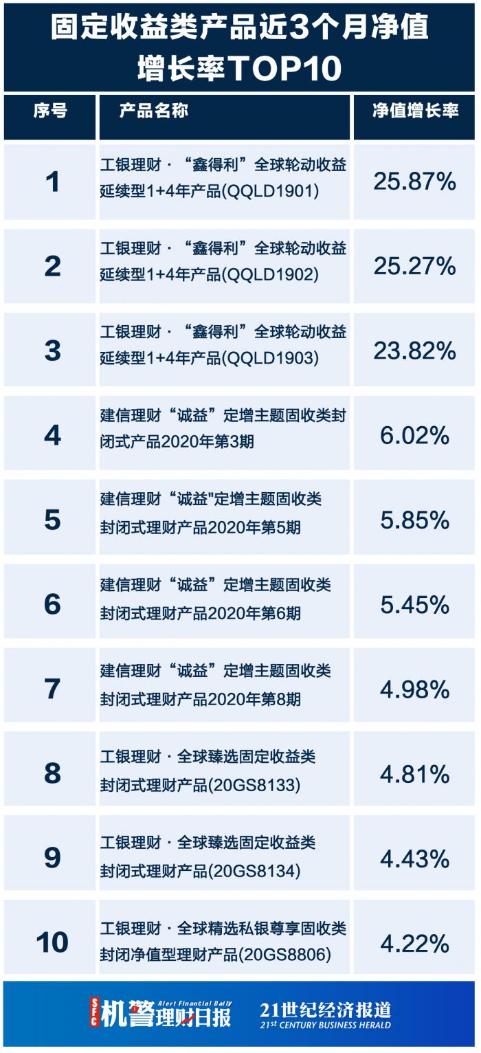 据南财理财通数据显示,在固定收益类产品中,近3个月净值增长率最高的是工银理财“鑫得利”全球轮动系列,净值增长率高达25.87%,该系列占据榜单排名的第1-3位。
