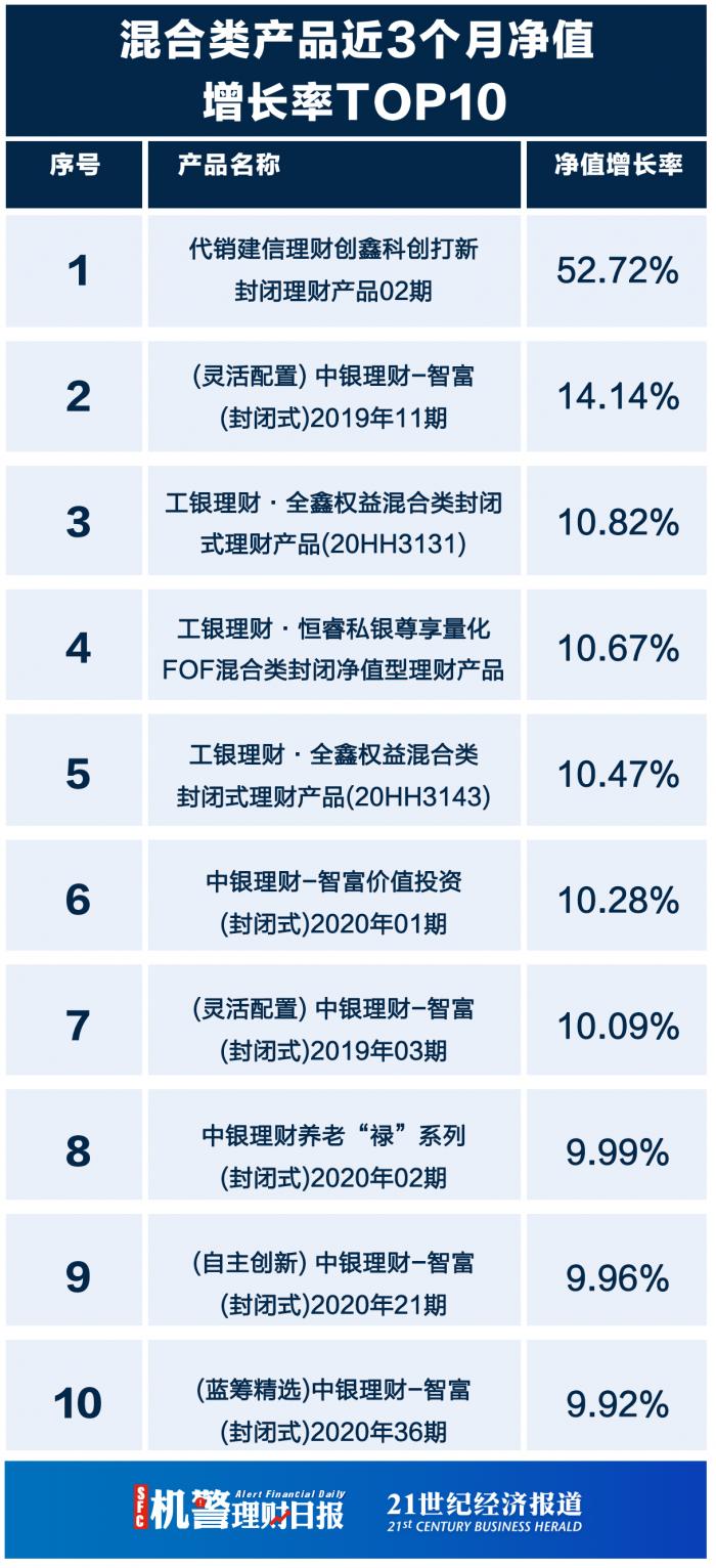 据南财理财通数据显示,在混合类产品中,近3个月净值增长率最高的为建信理财创鑫科创打新封闭式理财产品02期,净值增长率高达52.72%。