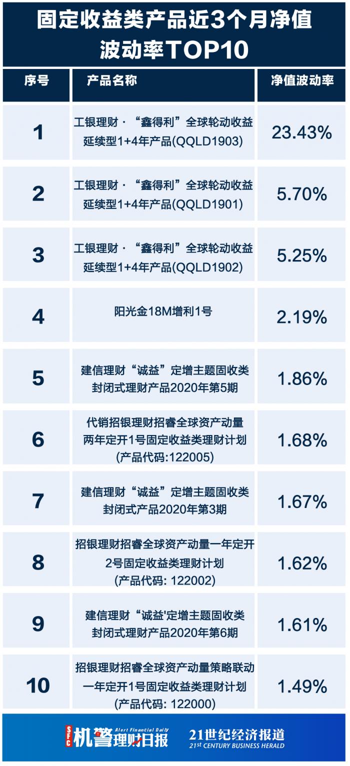 据南财理财通数据显示,在固定收益类产品中,近3个月净值波动率最高的产品为工银理财“鑫得利”全球轮动系列,达23.43%,该系列恰为近3个月净值增长率最高的固收类产品,体现出收益与风险相匹配的原则。