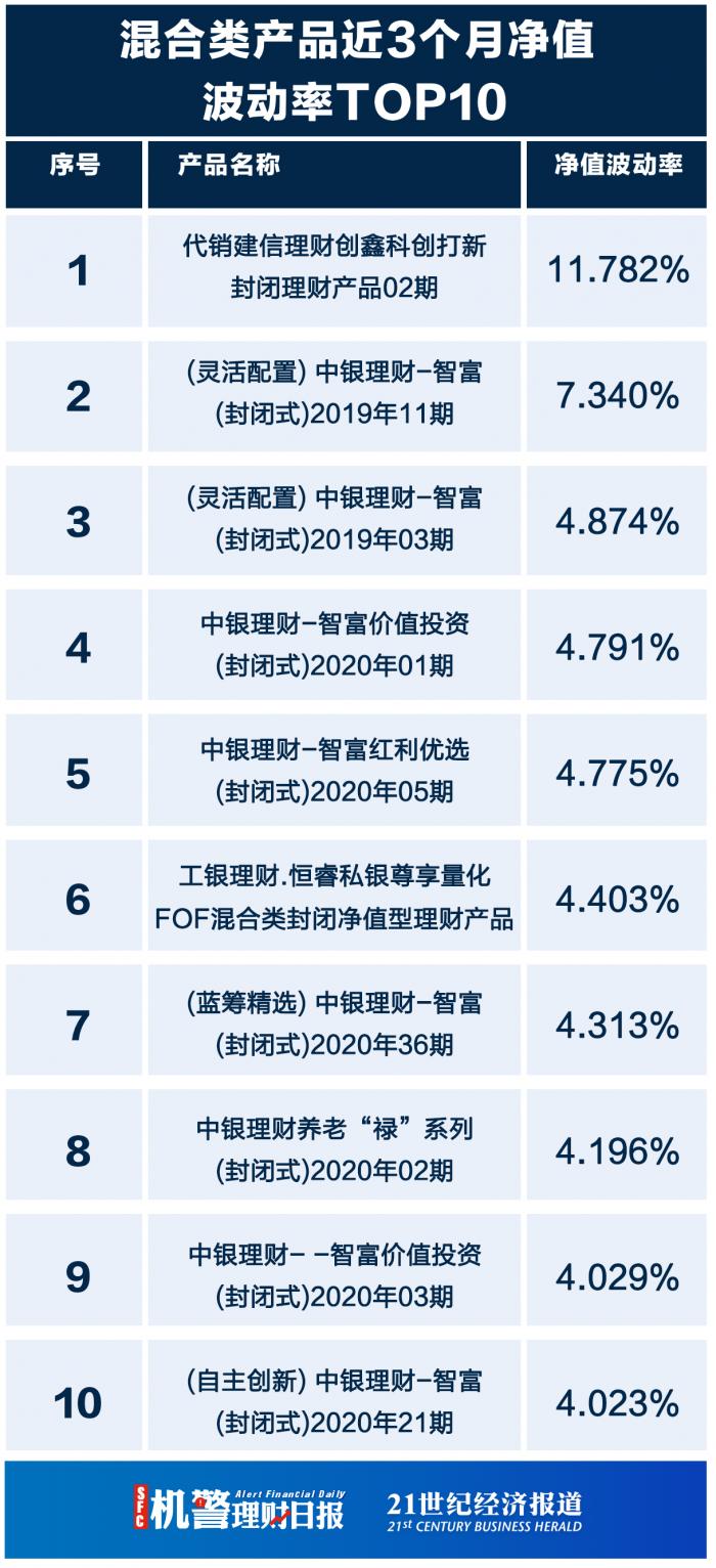 据南财理财通数据显示,在混合类产品中,近3个月净值波动率最高的产品为建信理财创鑫科创打新封闭式理财产品02期,波动率为11.782%,该产品恰为近3个月净值增长率最高的混合类产品,体现出收益与风险相匹配的原则。