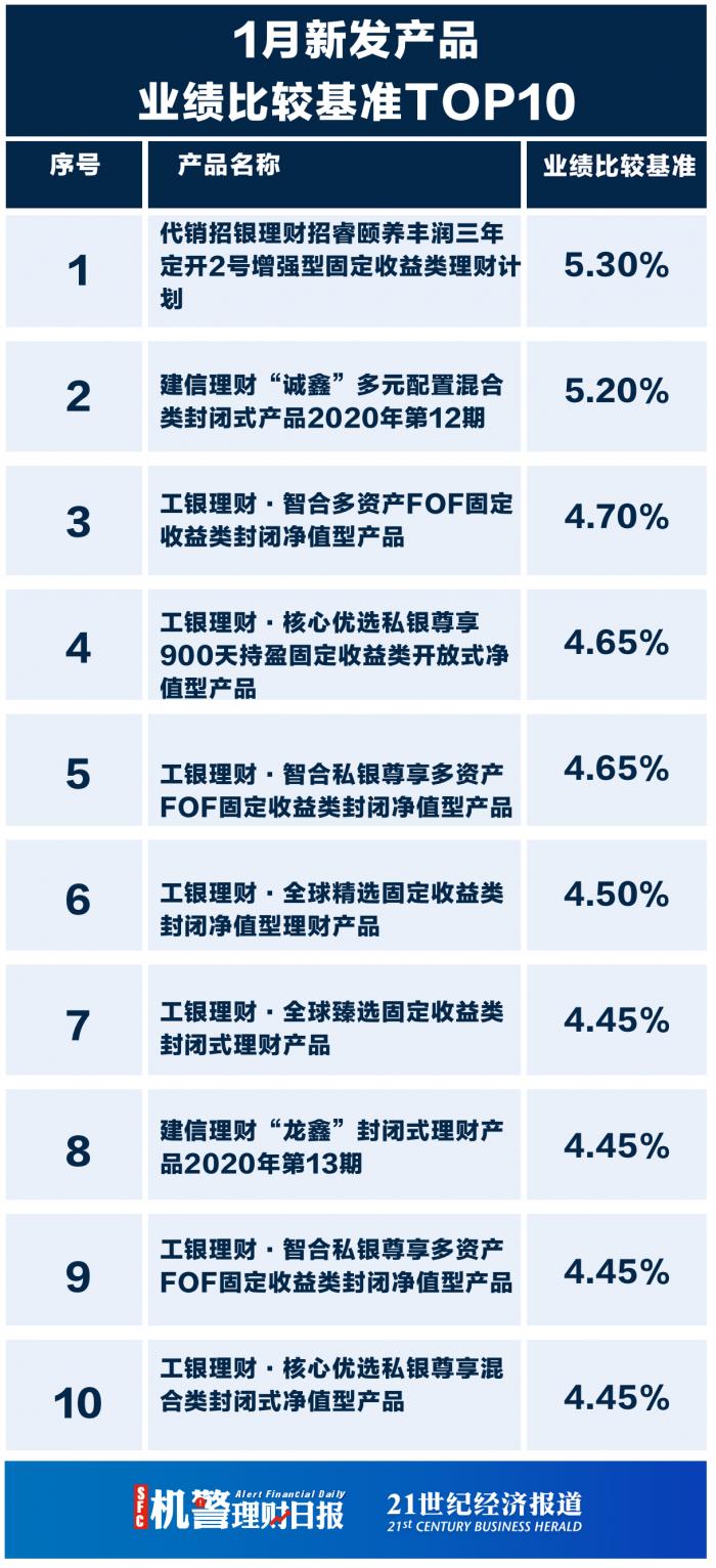 据南财理财通数据显示,在2021年1月的新发产品中,业绩比较基准排名前3的分别为: