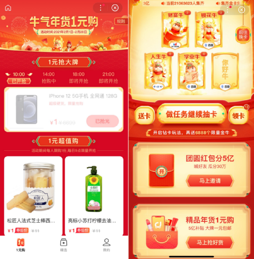 整个二月份,无论新老用户,都可以在百度App上每天分四个时段,不限次数的参与iPhone12、SK-II、五粮液等高价值大牌商品的秒杀活动,同时还有400多种商品直接降价到1元供用户选择。百度电商以这种半卖半送的形式吸引用户来“薅羊毛”,以此提高用户参与度。