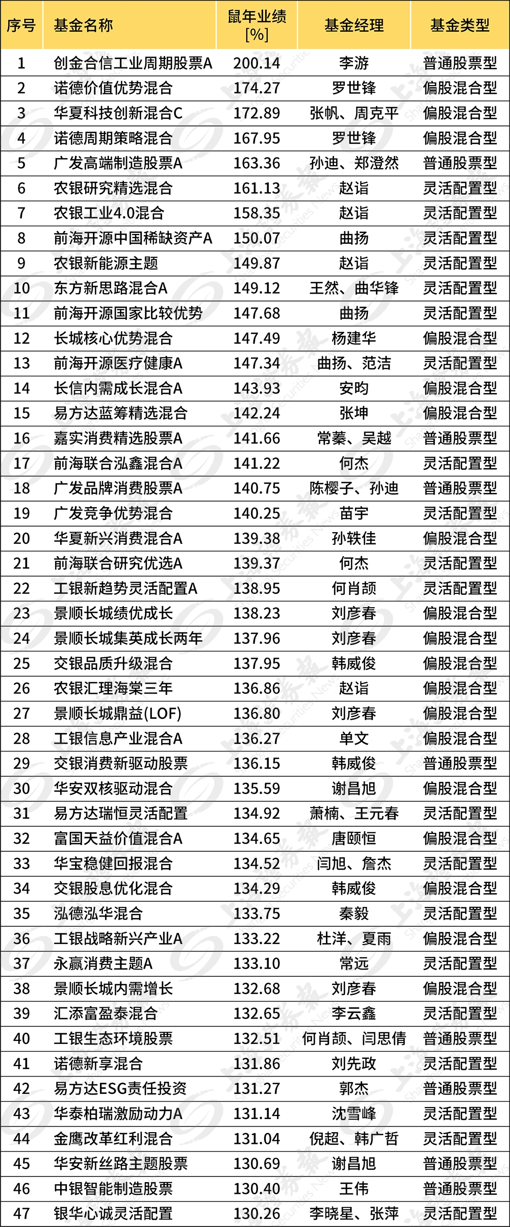 统计数据显示,整个农历鼠年,343只偏股基金收益翻倍,其中有47只基金的收益超过130%,收益最高的基金达到了200%。