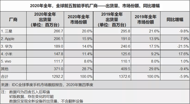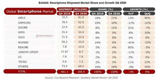 以2020年Q4数据对比2019年Q4来看,全球前十名的手机厂商排名及份额并无明显改变: