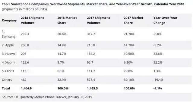 自2016年起,华为、OPPO、小米、vivo持续站稳全球前六,即便在全球、中国市场双降的2018年,这四大国产手机品牌依旧保持全球出货量增加,成为逆势增长的独特风景。