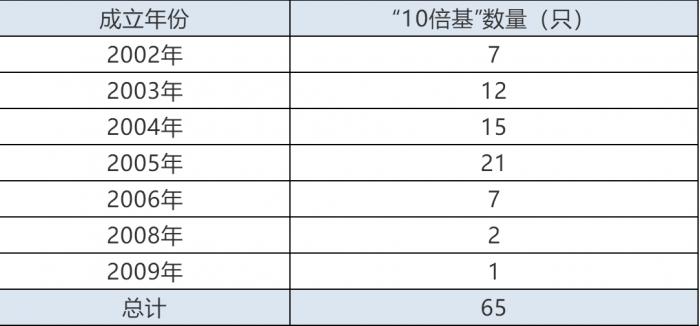 具体来看,从年份看,这些基金主要是集中于2003年至2005年成立的主动权益类基金,数量分别达到12只、15只、21只,而没有一只“10倍基金”出现在大牛市所在的2007年。