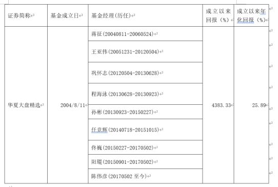 提及华夏大盘精选,行业内自然而然想到曾经的“公募一哥”王亚伟。他自2005年12月31日正式管理该基金,2006年即夺得半程冠军,当年全年收益率高达154.49%排名第12位,2007年、2009年两次夺冠,2010年排名第七,2008年大熊市和2011年的熊市均极为抗跌,从2006年到2012年5月4日离任,王亚伟给华夏大盘精选带来了近12倍的回报。后续接任的基金经理的表现也可圈可点。