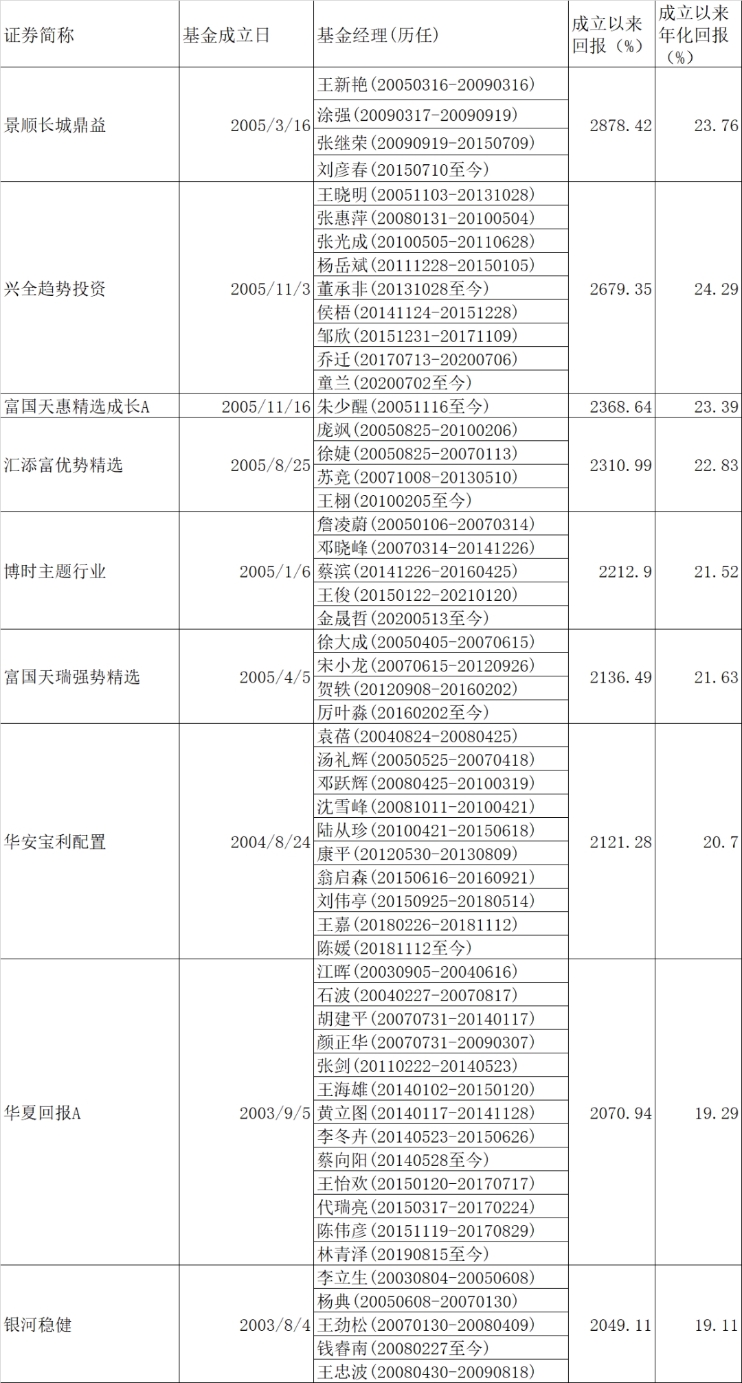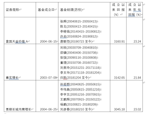 可以说,这些基金基本成立于市场最为冷清之际,尤其是2003年至2005年多数时候在1000点左右徘徊,而一批优秀的基金经理抓住了市场中长期优秀表现的优质个股,实现基金净值翻十倍以上。对投资者来说,可以说市场最冷之际,正是布局最好时刻。