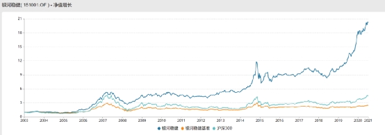 成立于2003年8月的银河稳健,运作至今的总回报为2049.11%,同样是一枚业绩不俗的”20倍牛基”。该基金先后经历了5位基金经理管理,第二任基金经理杨典任职期间获得228.04%的收益,抓住了2006年2007年的牛市。而现任基金经理为钱睿南,他自2008年2月管理该基金至今,任职总回报为358.07%,大幅跑赢基准。