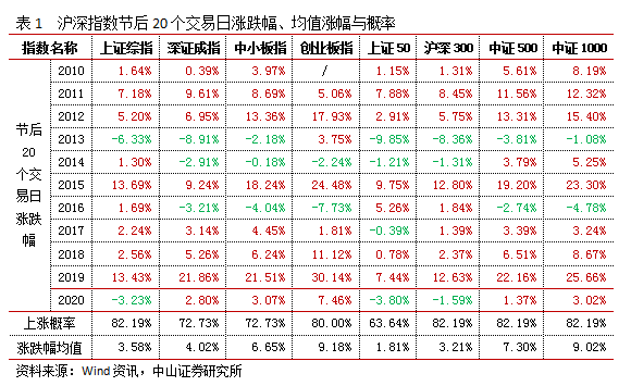 其四,历史规律发现,节后红包行情大概率延续。总结历史规律发现,自2010年以来,春节过后的20个交易日内,除上证50仅63.64%外,沪深两市主要指数上涨的概率均超72%,其中,上证综指、沪深300与创业板指等指数上涨概率超82%,仅2013年、2020年出现回调调整。涨跌幅方面,中证500与创业板的均值涨幅居前。市场结构表现方面,上证50上涨的概率以及均值涨幅略逊于其他指数。