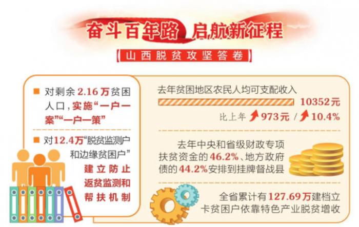 2020年是脱贫攻坚决战决胜之年。脱贫攻坚遭遇新冠肺炎疫情影响,任务更重,要求更高。省委省政府坚决贯彻落实习近平总书记关于统筹推进疫情防控和经济社会发展的一系列重要讲话、重要指示批示精神,把习近平总书记视察山西重要讲话重要指示落到实处,努力克服新冠肺炎疫情带来的不利影响,精准发力集中攻坚,狠抓问题排查整改,对剩余2.16万贫困人口,实施“一户一案”“一户一策”,落实开发式扶贫和保障性兜底政策,对12.4万“脱贫监测户和边缘贫困户”建立防止返贫监测和帮扶机制,给予免费技能培训、小额信贷贴息、产业就业扶持,帮扶措施做到全覆盖。去年贫困地区农民人均可支配收入10352元,比上年增加973元,增长10.4%。