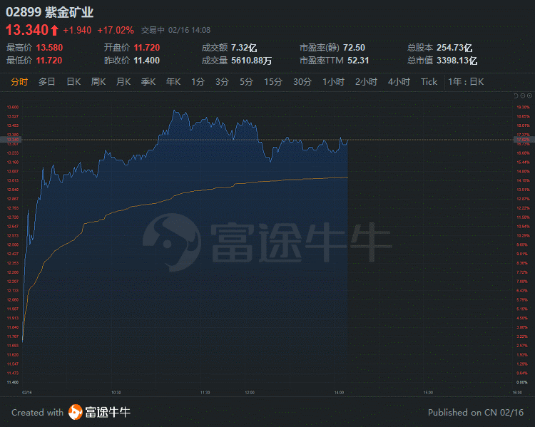 截至发稿,紫金矿业涨超17%,报13.3港元,距高盛目标价有18%上行空间,总市值3398.1亿港元。