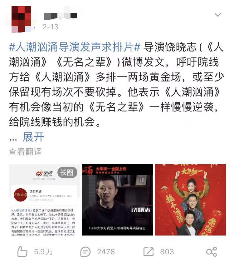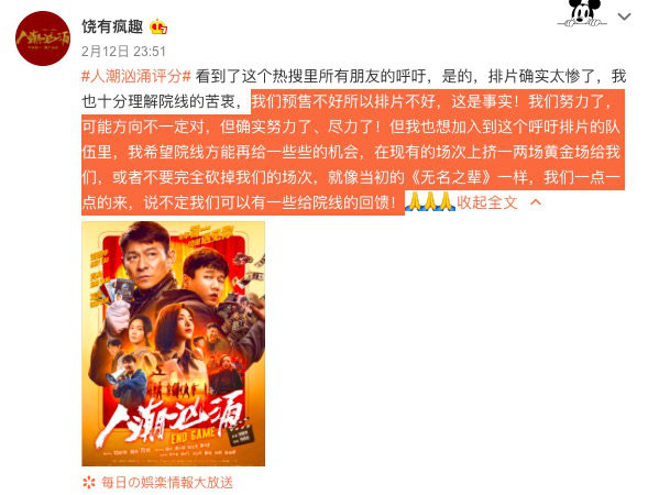 饶晓志导演在微博上表示,“我们预售不好所以排片不好,这是事实!我们努力了,可能方向不一定对,但确实努力了、尽力了!但我也想加入到这个呼吁排片的队伍里,我希望院线方能再给一些些的机会,在现有的场次上挤一两场黄金场给我们,或者不要完全砍掉我们的场次,就像当初的《无名之辈》一样,我们一点一点的来,说不定我们可以有一些给院线的回馈!”但是显然时不我待,春节档转纵即逝,院线能《人潮汹涌》“回馈”的空间并不多。