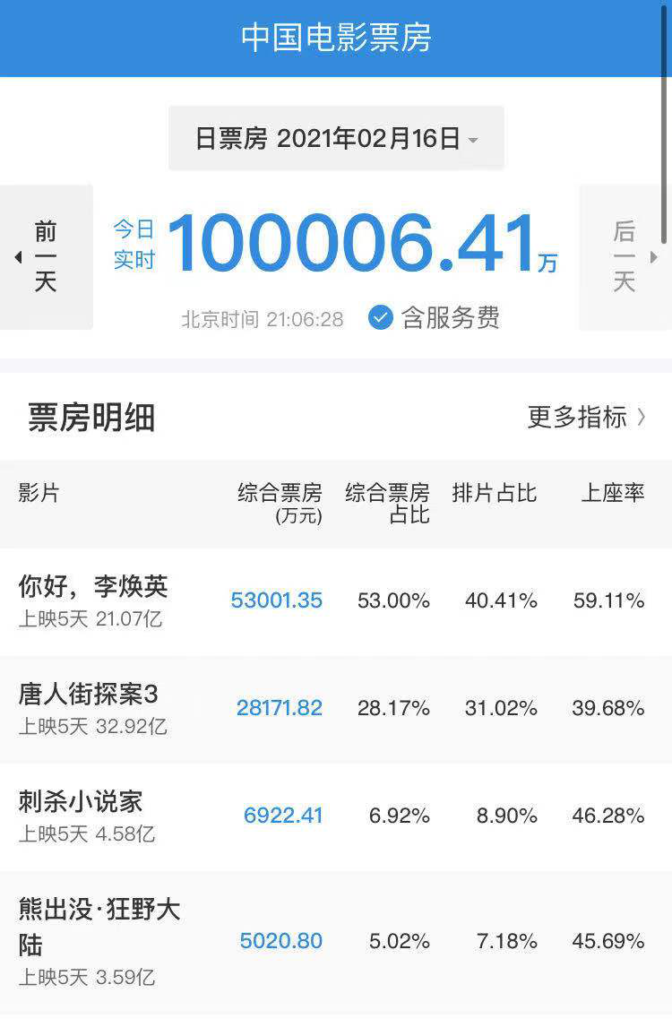 今天(2月16日)票房市场已经出现了第二轮更迭。《唐探3》口碑持续崩坏,票房增速放缓,单日票房与排片占比被《李焕英》全面反超,仅保持着总票房领先优势。截至写稿时间,《唐探3》排片从初一、二40%以上的排片,下滑至31%。