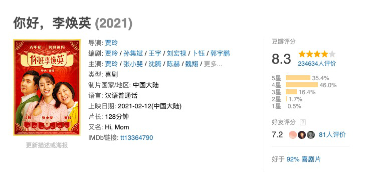 但是事情发展总是有诸多分支。正月初一7部影片口碑溢出,《人潮汹涌》猫眼超过9.0分,淘票票8.9分,而豆瓣评分达到7.3分,评价并不差,但是春节档的最佳口碑之作却是《李焕英》。第二梯队的《李焕英》本身就因为喜剧题材与贾玲、沈腾的主演阵容颇具市场好感度,有了口碑加持之后更是锦上添花,一举追上了《唐探3》。