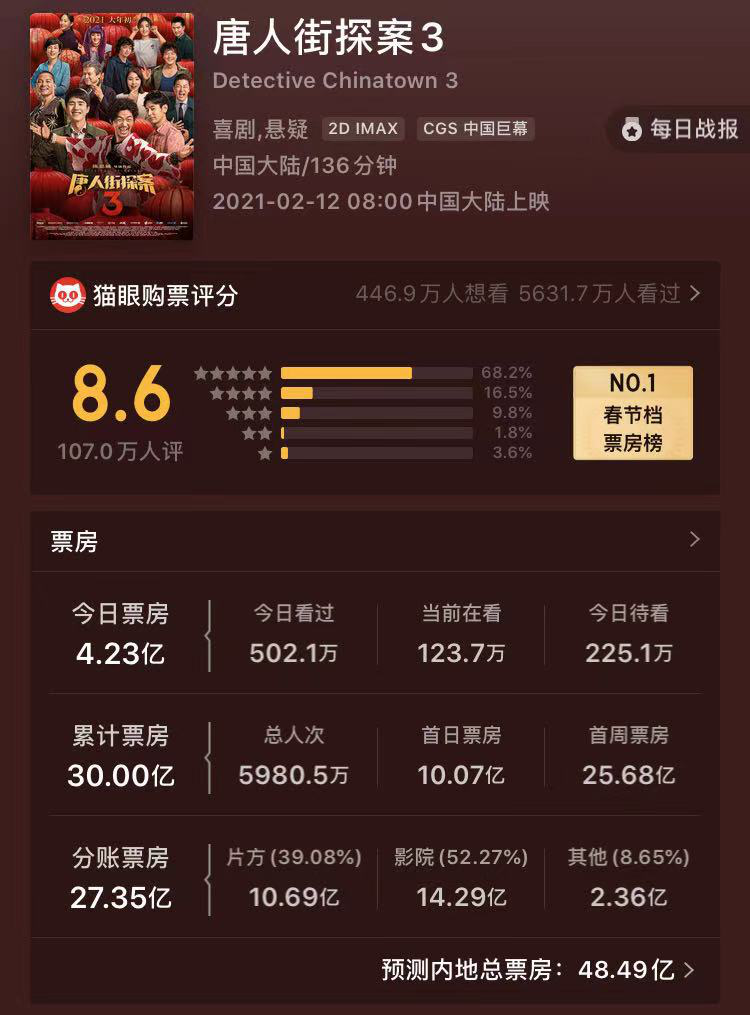 到目前,《唐探3》累计票房达到30亿,依旧完成领跑,但是《李焕英》以单日5亿票房实现逆袭,而未来两天《李焕英》预售票房依旧超过了《唐探3》这无疑对《唐探3》的60亿票房之路产生冲击。猫眼专业版对《唐探3》总票房的预测从62.94亿下调至45.82亿。