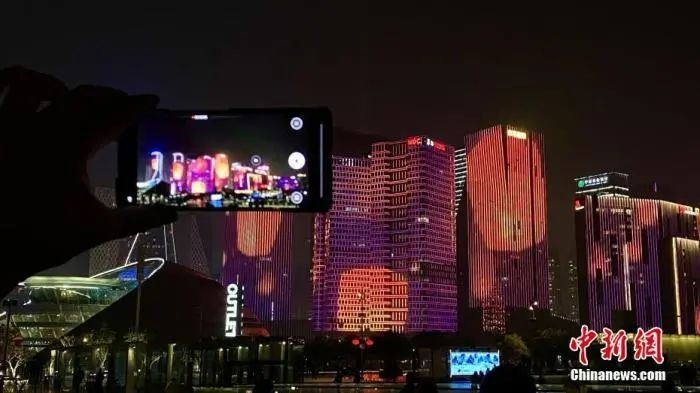 2月16日,浙江杭州,以“金牛贺岁,欢乐祥瑞”为主题的杭州牛年贺岁版灯光秀在钱塘江畔上演。图为游人用手机拍摄灯光秀。中新社记者 钱晨菲 摄
